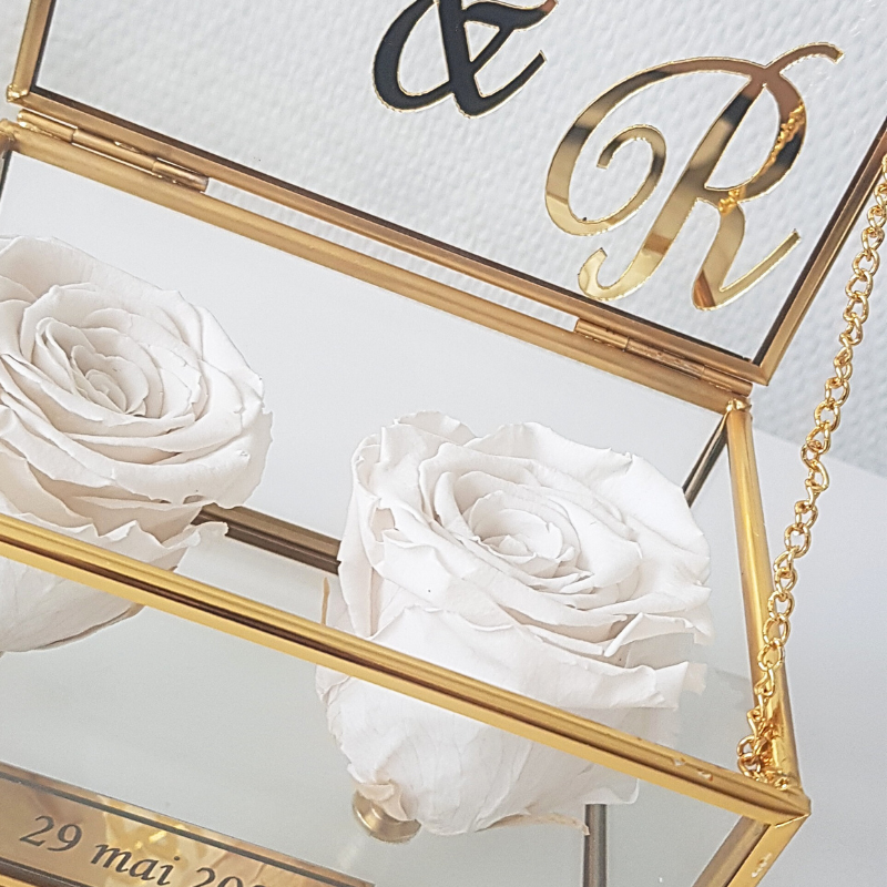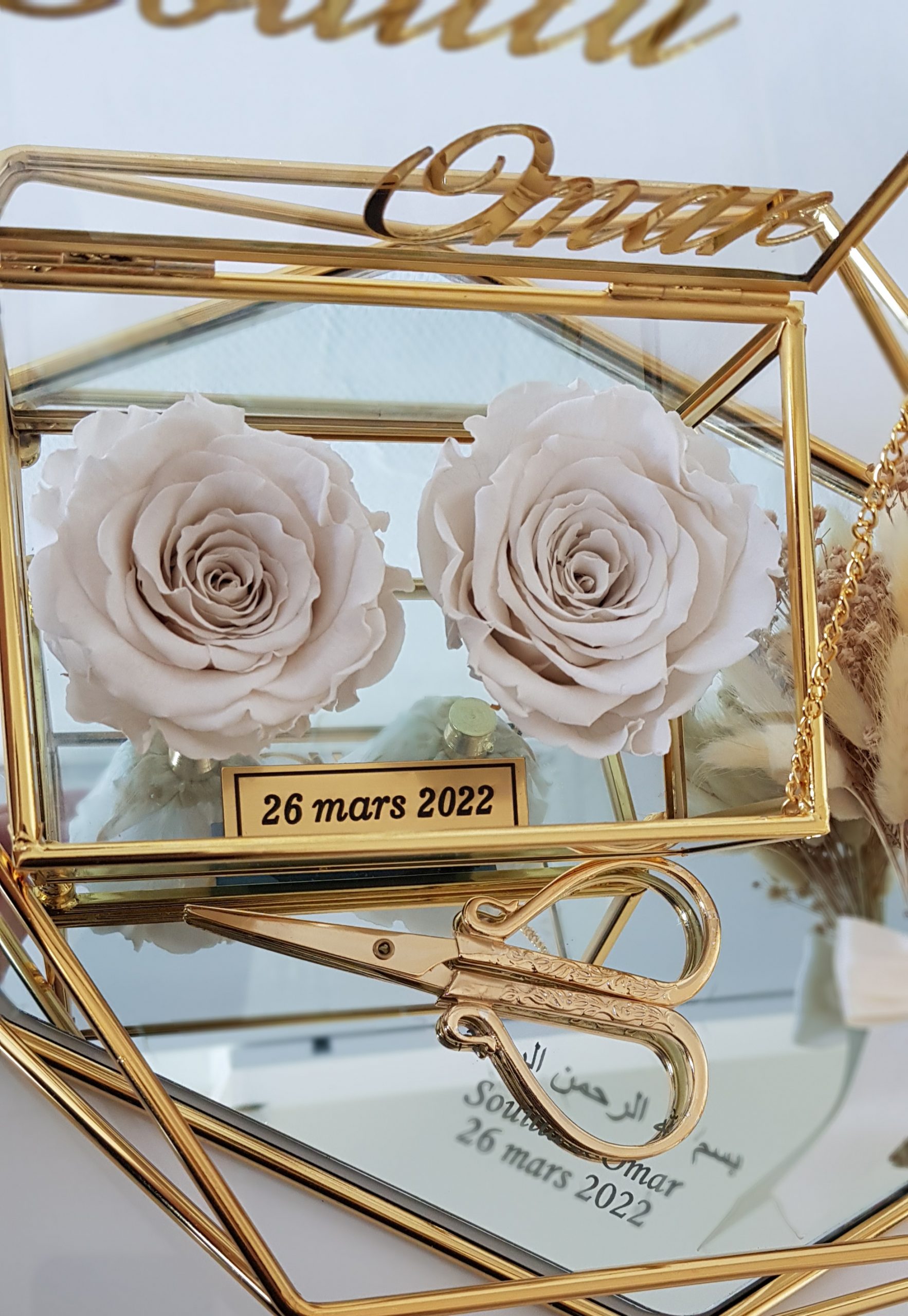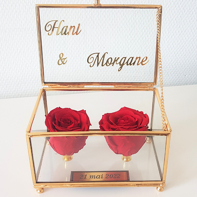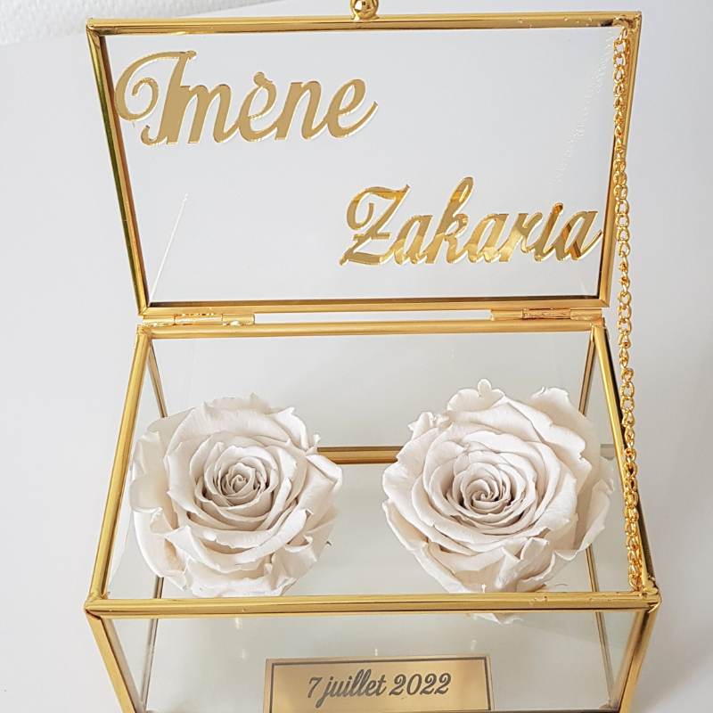 À l’intérieur de cette boîte précieuse, deux roses éternelles symbolisent l’amour et la durabilité de votre union. Ces fleurs intemporelles, associées à une personnalisation raffinée — que ce soit vos prénoms entiers, vos initiales ou la date de votre mariage — rendent cet objet unique et particulièrement symbolique. C’est bien plus qu’un simple accessoire, c’est un souvenir inestimable qui traversera le temps.