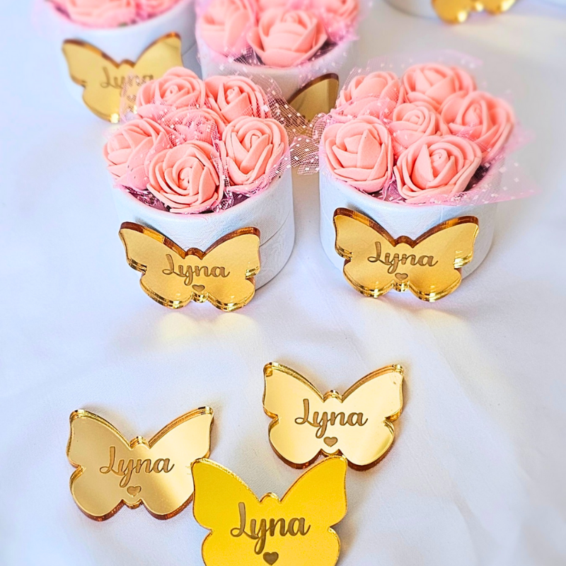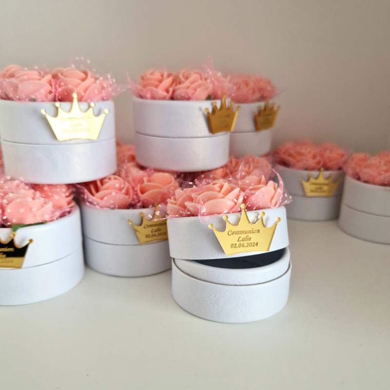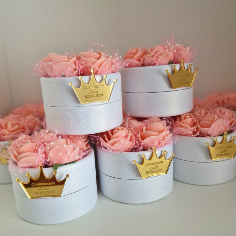 Tout d’abord, cette boîte en carton de 5 cm de diamètre, raffinée, apporte une touche d’élégance à votre table ou à vos cadeaux invités. Ensuite, son design simple mais sophistiqué, dont les fleurs sont délicatement posées sur le dessus, apportent une note de fraîcheur et de couleur. Enfin, la personnalisation se fait par le biais d’une plaque gravée, dont la forme peut être choisie en fonction du thème de votre événement. Un mariage, une fête d’anniversaire ou une cérémonie de baptême intime, cette boîte s’y adaptera grâce à ses options de personnalisation. A vous de jouer…