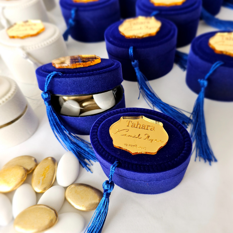 Découvrez notre boîte en velours personnalisée, un cadeau invité élégant et raffiné, parfait pour contenir dragées, bonbons, chapelets, chocolats, etc… Plaque personnalisée incluse pour une touche unique.