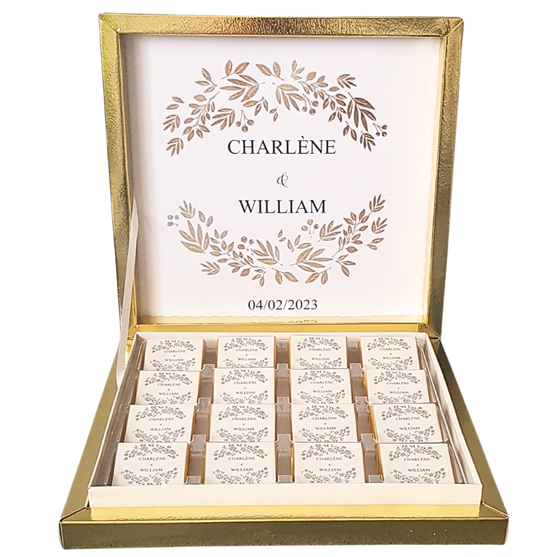 À l’intérieur de cette superbe boîte se trouvent 32 délicieux chocolats au lait. Ils sont soigneusement sélectionnés pour leur goût onctueux et savoureux. Ainsi, chaque chocolat est une petite bouchée de bonheur, idéale pour accompagner vos moments de célébration. Offrir cette boîte de chocolats personnalisée, c’est faire plaisir autant par la vue que par le goût.