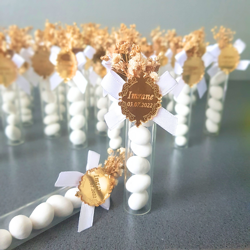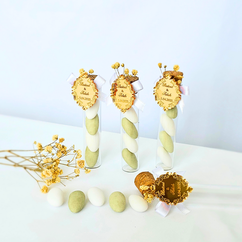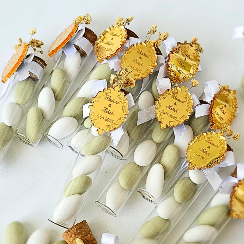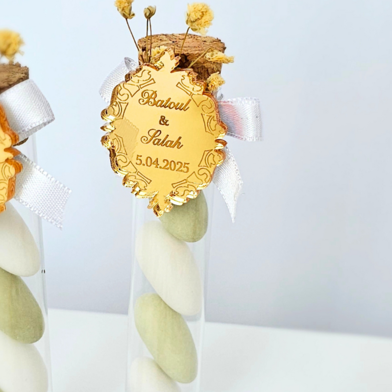 Ajoutez une touche d’élégance à votre cérémonie avec notre fiole de dragées personnalisée, un cadeau invité aussi beau que symbolique. Chaque fiole est décorée avec soin : ruban satiné plaque dorée gravée avec prénoms, date ou un mot doux.