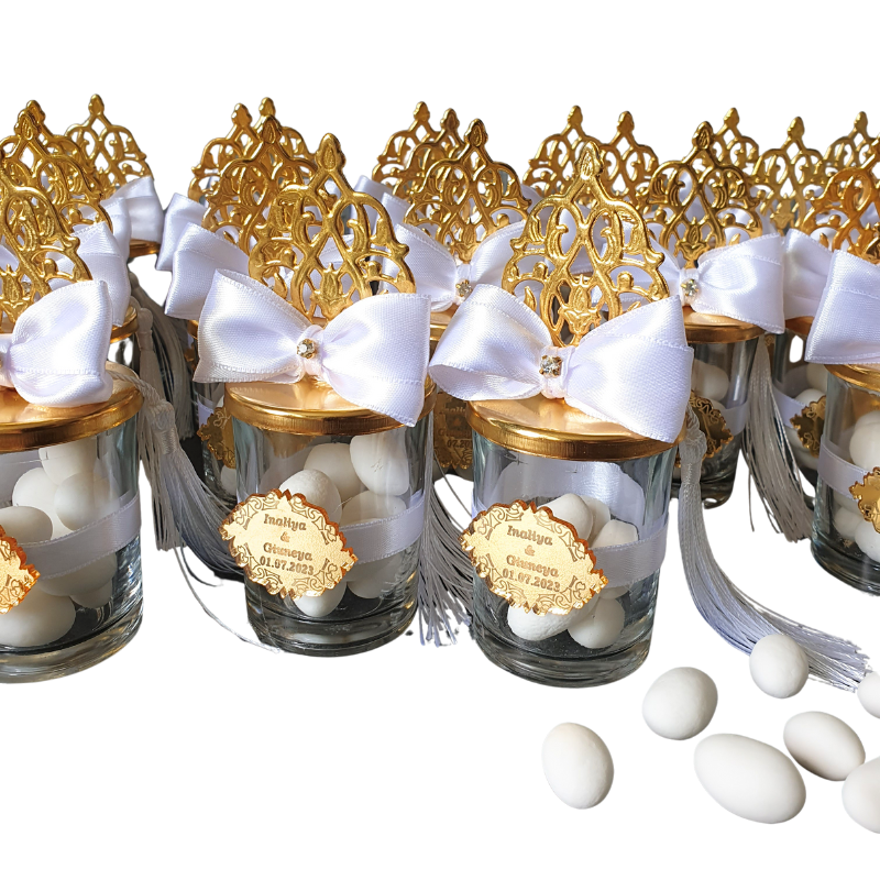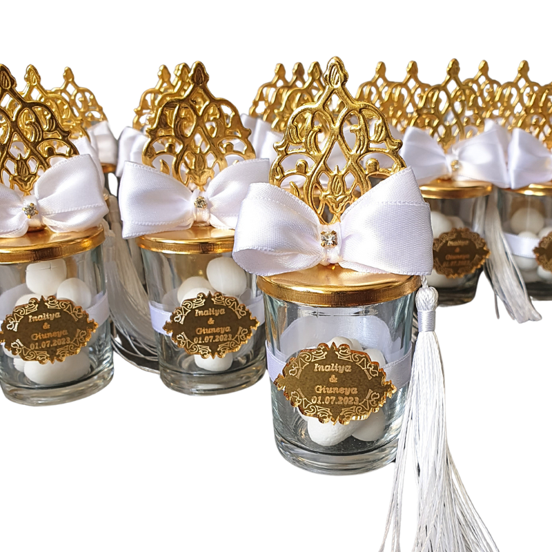 Notre contenant en verre oriental est l’alliance parfaite entre élégance et tradition. En effet, couronné d’un couvercle doré orné d’une couronne de style oriental, incarne la sophistication avec son design délicat. Il peut accueillir entre 8 et 10 dragées, selon leur taille. Faisant de lui un choix idéal pour offrir des douceurs lors de vos événements marquants tels que mariages, baptêmes ou fiançailles.