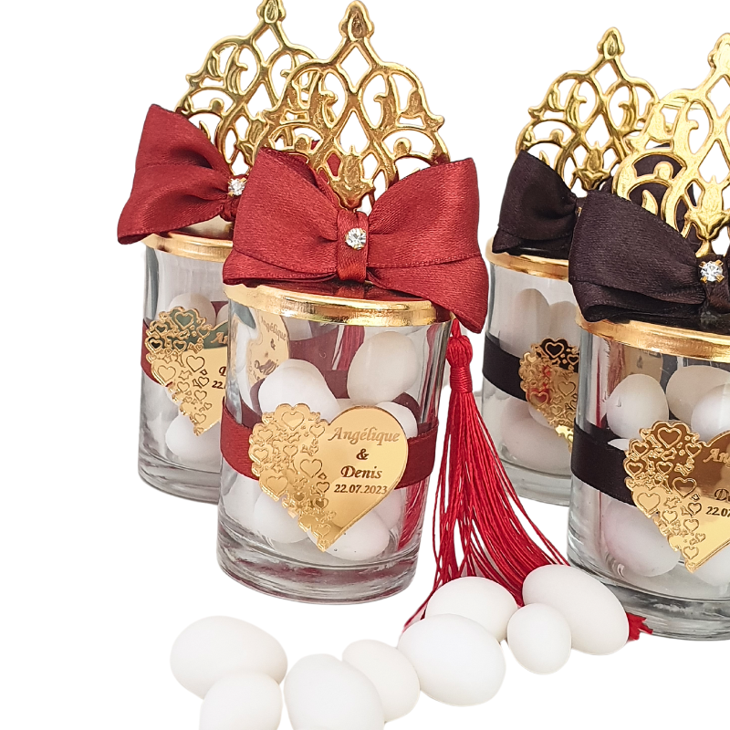 Avec sa personnalisation raffinée et ses détails élégants, ce contenant en verre oriental est l’accessoire indispensable. Il réhaussera ainsi la décoration de vos tables et laissera une impression durable à vos invités. Que ce soit pour une cérémonie ou un événement intime, il allie à la fois tradition et modernité, créant un véritable souvenir de votre moment spécial.
