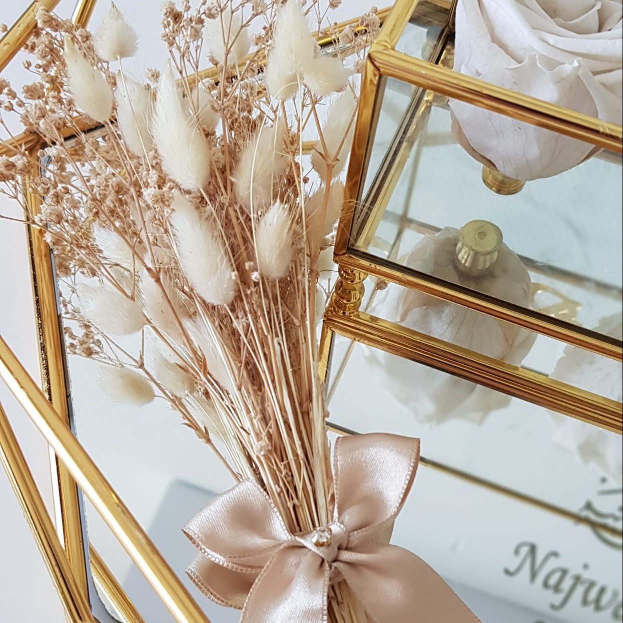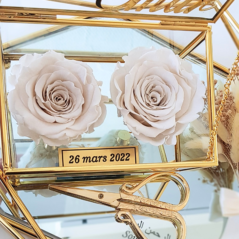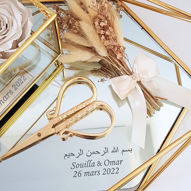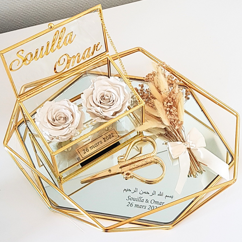 Le plateau alliances personnalisé inclut une boîte à alliances personnalisée, magnifiquement décorée de roses éternelles, symbole d’amour durable. Accompagnée d’un bouquet de fleurs séchées et d’un ciseau doré (pour couper le ruban liant les deux alliances). Chaque détail de cet ensemble est pensé pour apporter une touche de raffinement à votre cérémonie. Les matériaux choisis avec soin en font une pièce décorative qui saura attirer les regards et s’intégrer parfaitement à l’esthétique de votre événement.